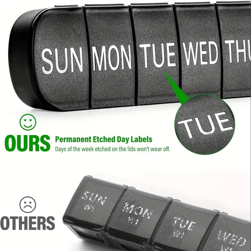Keep your medication organized with this seven-compartment pill storage box. Available in both black and white colors, each compartment is labeled with a date, making it easy to remember when to take your pills. Crafted from high-quality PP plastic, this pill box is durable, lightweight, and designed for easy portability. The secure lid ensures your medication is safely stored and easily accessible when needed.