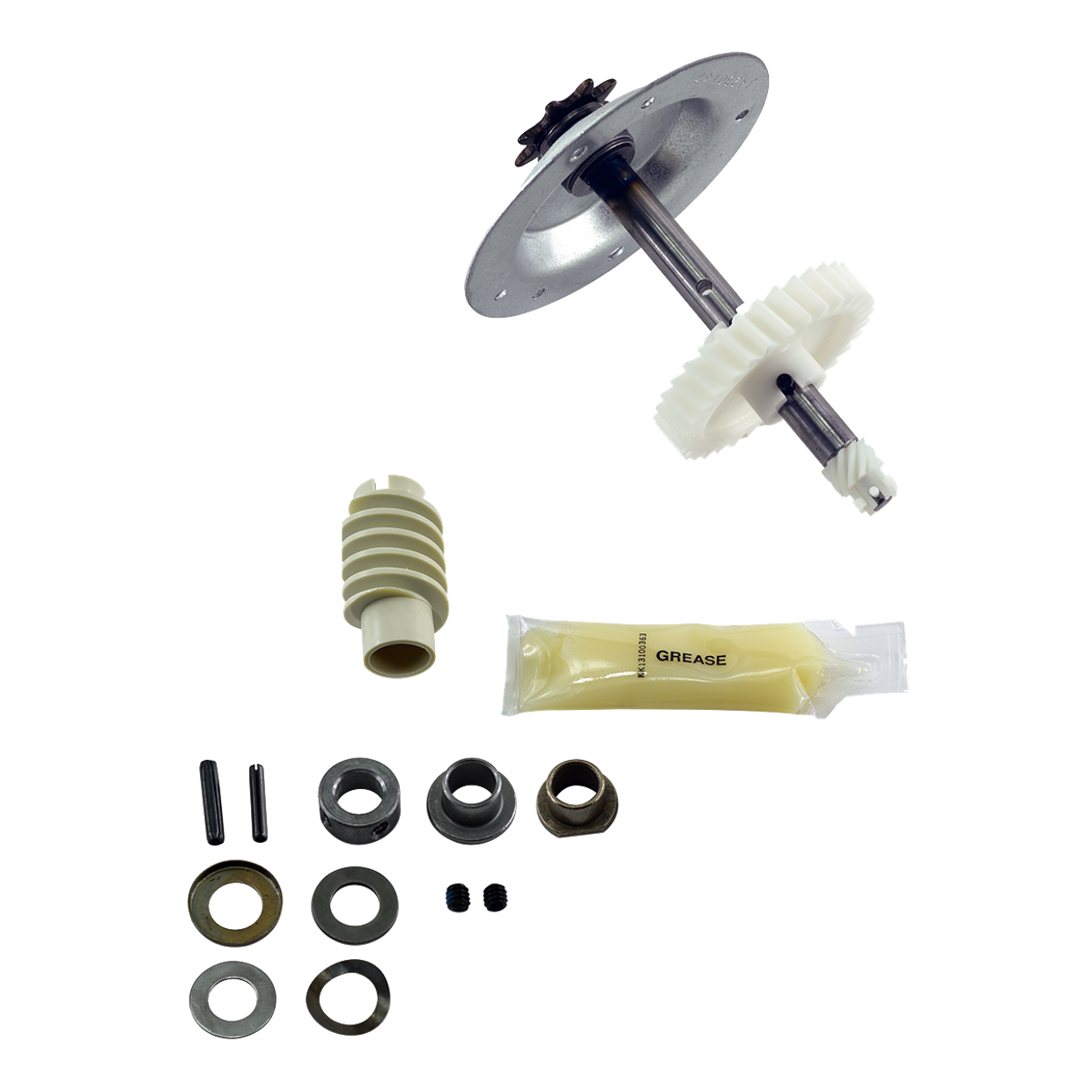 041C4220A is a complete gear and sprocket replacement kit. This gear and sprocket assembly is compatible with various chain drive garage door openers manufactured after 1993. This complete gear kit includes; helical gear and top hat assembly, worm gear, wear bushings, grease, and hardware needed to replace the chain drive gears. Check the manual for model number before ordering to ensure compatibility