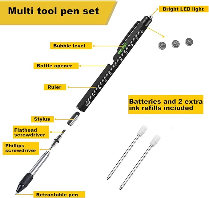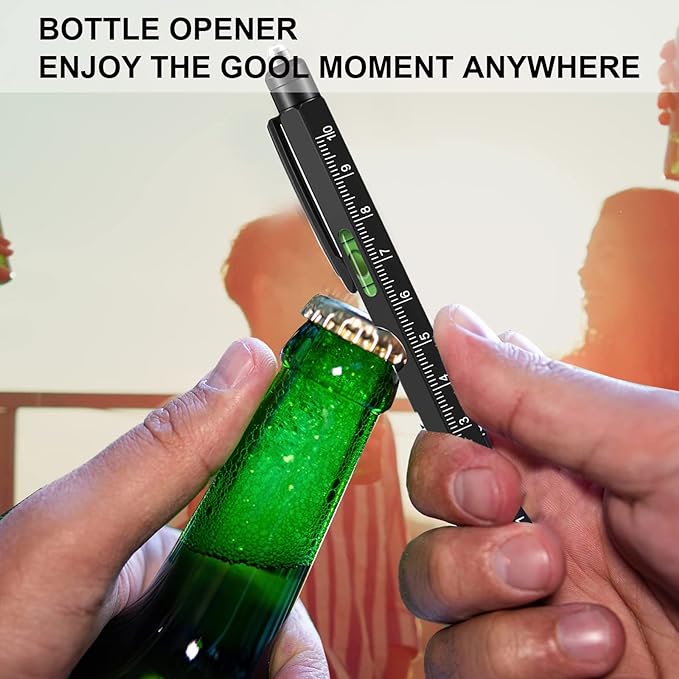 - Multiple Functions: With features including an LED flashlight, stylus, bubble leveler, bottle opener, phone holder, metric rulers, flathead and Phillips screwdriver, and ballpoint pen, our multi-tool pen has everything you need for various tasks.